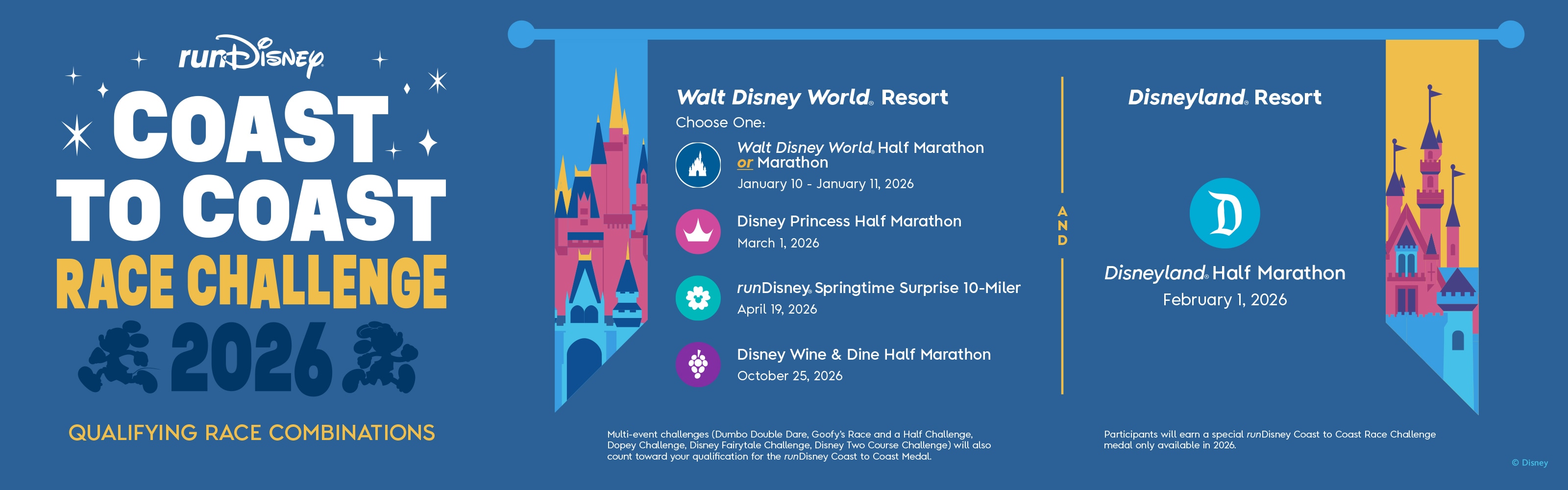 Complete any 10-mile race––or longer––at both Walt Disney World® Resort and the Disneyland® Resort in the same calendar year and receive a runDisney Coast to Coast Race Challenge medal! Read everything you need to know about how to Qualify for a runDisney Coast to Coast Medal. Two Tracks are offered.